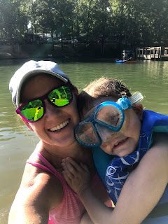 The first day we spent mostly on the water. Kayaks, swimming, fishing, and just hanging out. Well, I pretty much just laid down in the kayak while kids swam around me. :) The biggest development of the day was we saw another camper who set a tent up right on the water and used it as home base. We followed suit and did the same thing on day two. We really stayed out there most of the day and didn't head back to the camper until later that evening. At one point during the day Caroline decided to hop in a kayak. She initially struggled trying to figure out how to paddle but eventually got the hang of it. And when she figured it out, she became a kayaking machine. She LOVES kayaking. I wasn't sure we'd ever get her out of that boat! :)